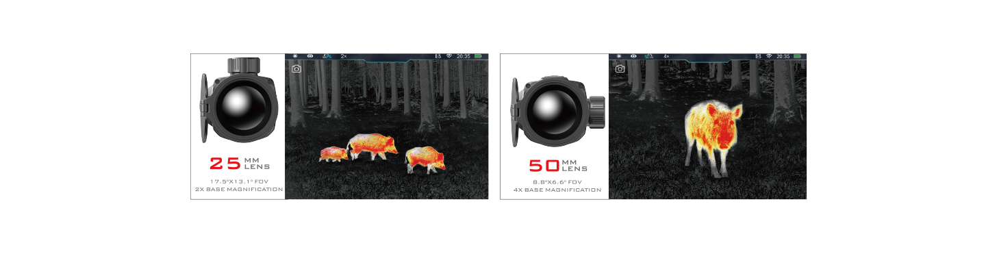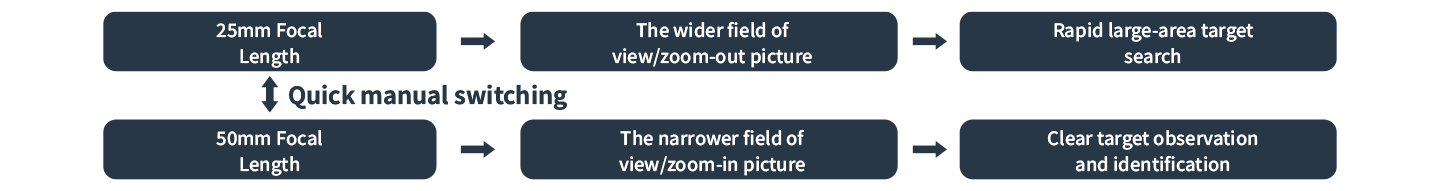 El campo de visión más amplio con una distancia focal de 25 mm se puede utilizar para la búsqueda de objetivos, mientras que el campo de visión estrecho con una distancia focal de 50 mm se puede utilizar para la identificación de objetivos.